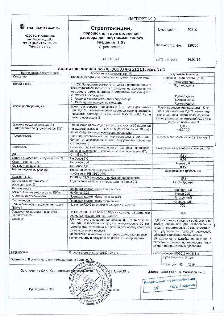 1 флакон содержит стрептомицина сульфата стерильного, в пересчете на стрептомицин 1 г.