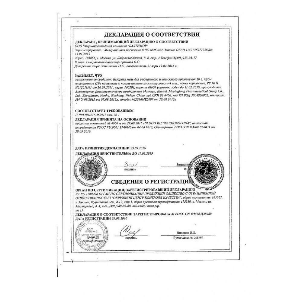 Применение. Стандартно мазь Безорнил нужно использовать утром и вечером. Приложенная салфетка или повязка с мазью усилит действие препарата. Для внутреннего введения средства в анус нужно подождать опорожнения кишечника. Процедуру удобно проводить с помощью наконечника. Колпачок есть в комплекте. Курс лечения длится около 14 дней. Проведение повторных курсов лечения определяется лечащим врачом.