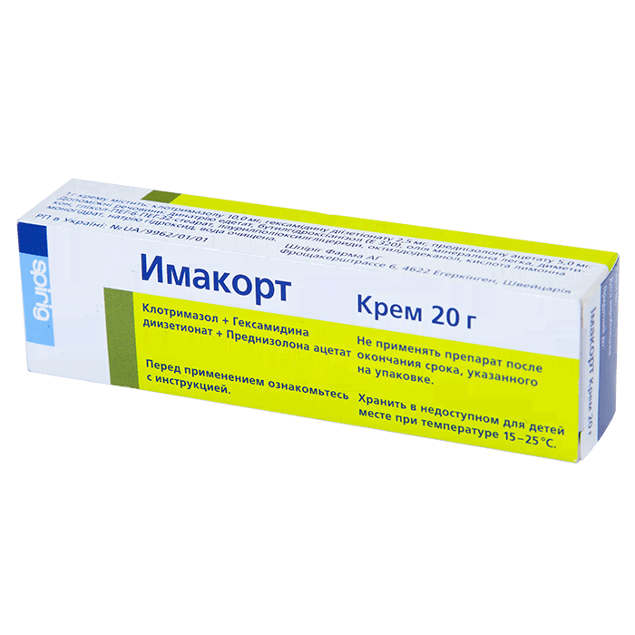 Крем Имакорт - кортикостероид для применения в дерматологии. Препарат обладает противовоспалительным действием, снижает экссудацию, уменьшает зуд. Его компоненты эффективно уничтожают грибки, патогенные бактерии. Противогрибковое действие обеспечивается клотримазолом, который снижает синтез эргостерола – важного компонента клеточных мембран. Еще один компонент Имакорта, гексамидин, усиливает действие клотримазола и позволяет ему воздействовать на некоторые грамотрицательные бактерии. Уменьшение воспалительной реакции обеспечивает преднизолон, который также снижает аллергические проявления. Активные компоненты препарата подобраны таким образом, чтобы предотвратить развитие вторичных инфекций, нередких при использовании преднизолона.