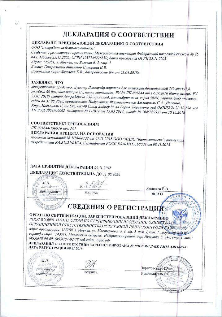 Продукт содержит два соединения: аклидиния и дигидрат фумарата формотерола. Оба они принадлежат к группе препаратов, называемых бронходилататорами. Бронходилататоры расслабляют мышцы дыхательных путей. Это позволяет дыхательным путям расширяться и облегчает дыхание. Расширяя дыхательные пути, лекарство снимает такие симптомы, как одышка. Регулярный прием Duaklir Genuair поможет свести к минимуму влияние ХОБЛ на вашу повседневную жизнь.