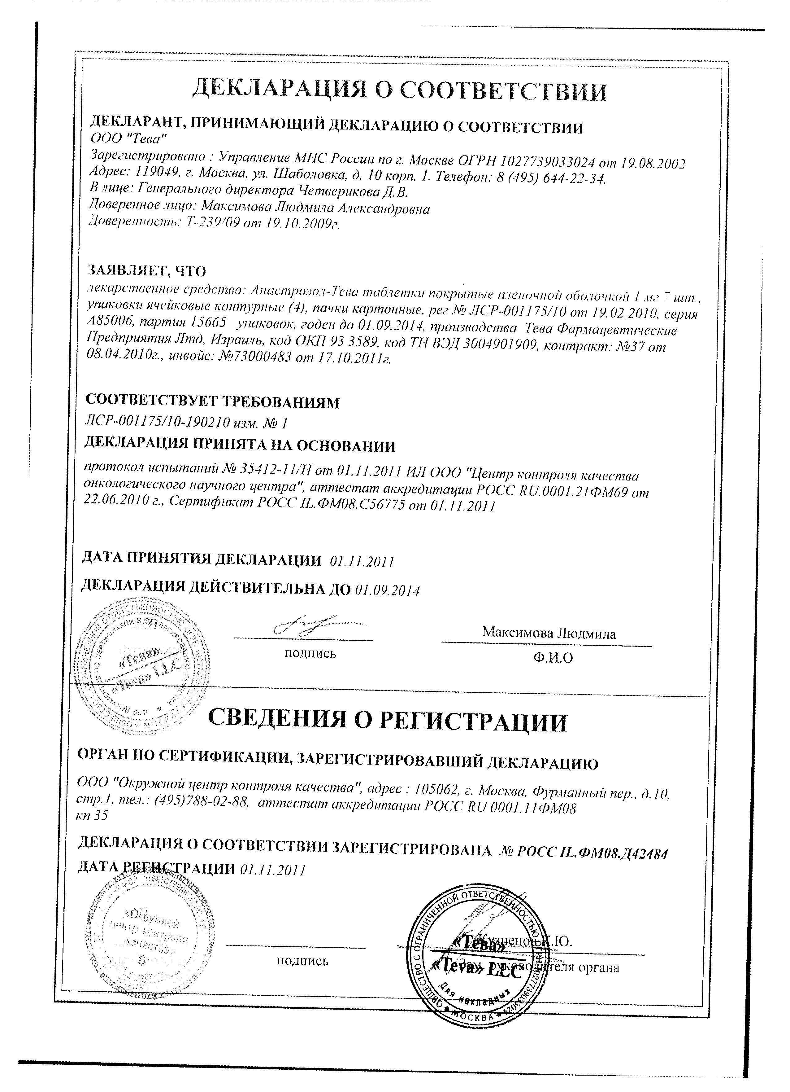 | Тамоксифен | Понижение эффективности препарата Анастрозол |